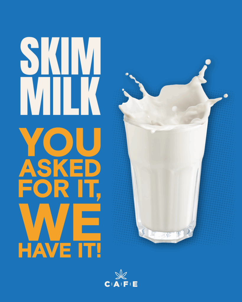 At CAFE, we believe that wellness is personal, and your coffee should match your lifestyle. Whether you’re building new routines or simply miss the nostalgia of a classic blue-and-white carton, skim milk gives you another way to customize your experience exactly how you like it.
