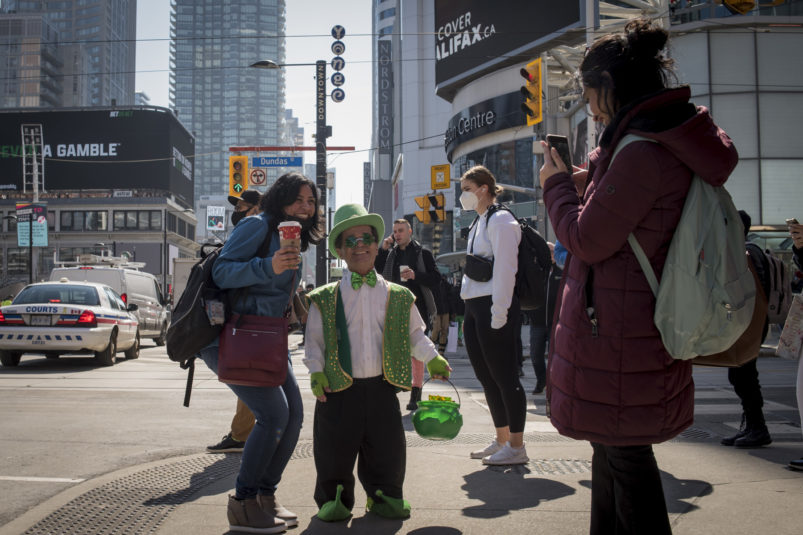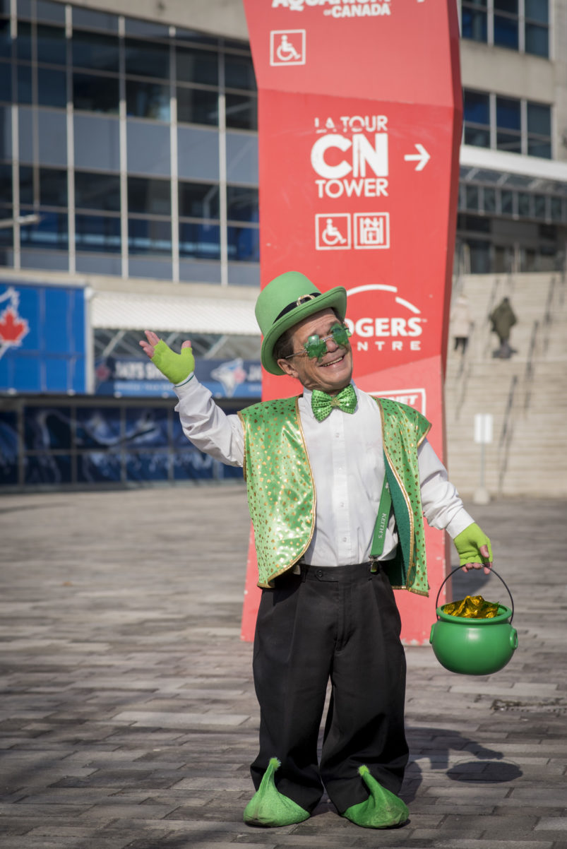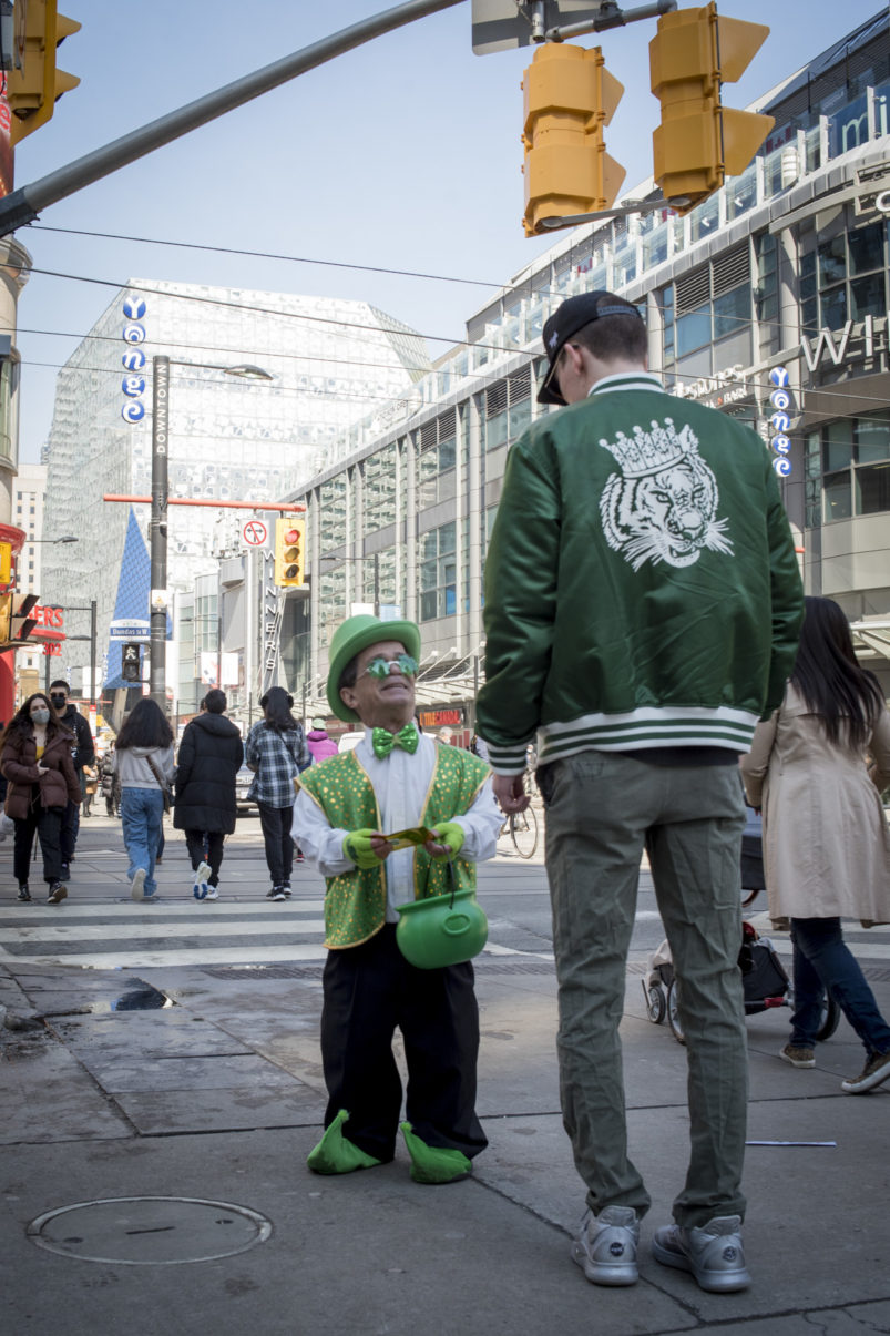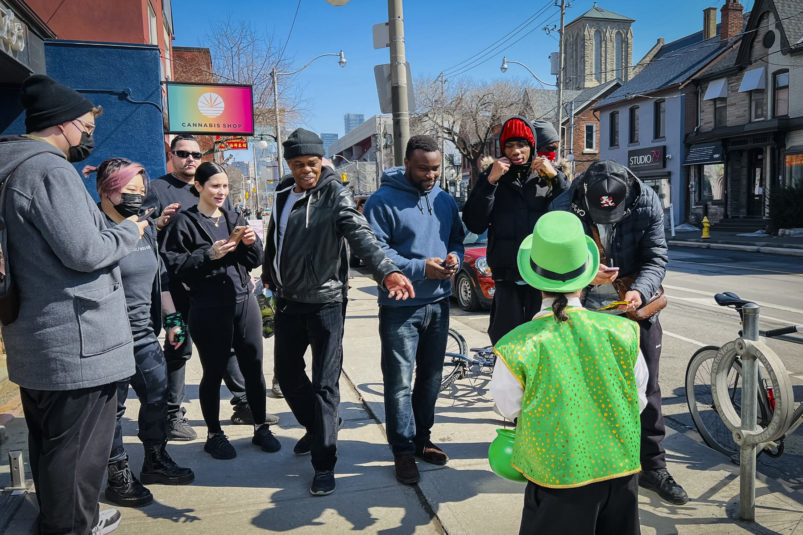 The day dawned bright and promising as our magical leprechaun leaped, pranced and danced his way through Toronto. With the sun out and temps at around 16 degrees, Torontonians were out and about in large numbers. The warm spring day definitely had everyone in a great mood – that was made even better by CAFE’s lucky leprechaun dancing about and handing out little golden nuggets to one and all! Our gold nuggets are for adults only, so kids had to miss out on this one. But we surely had a lot of very happy adults, and put a lot of big smiles on faces all across the city!
