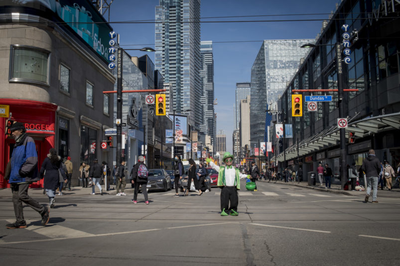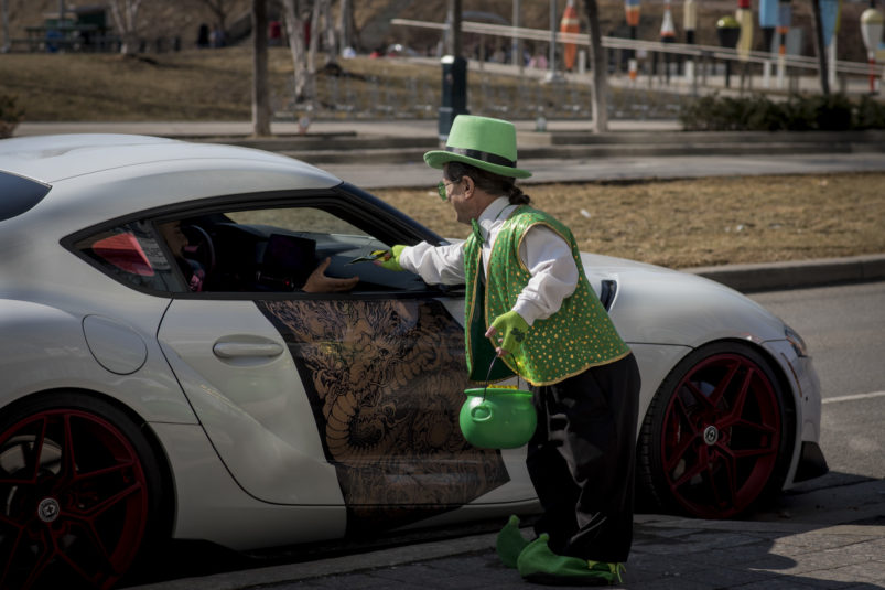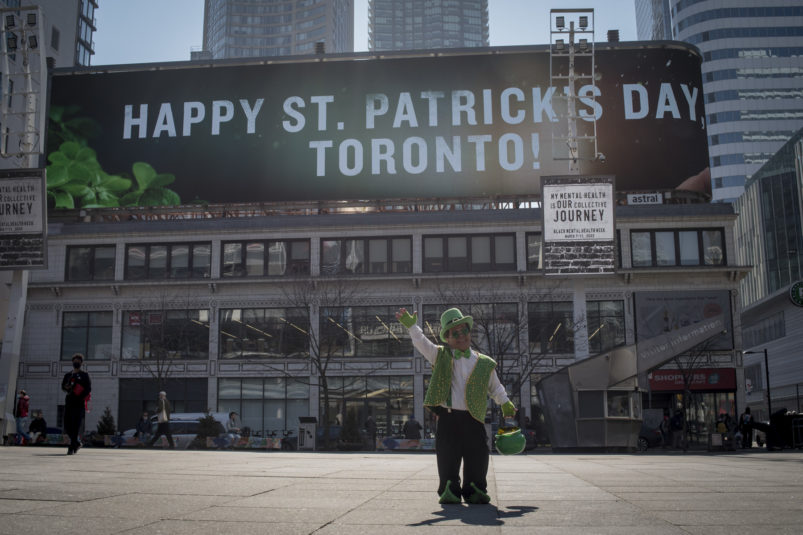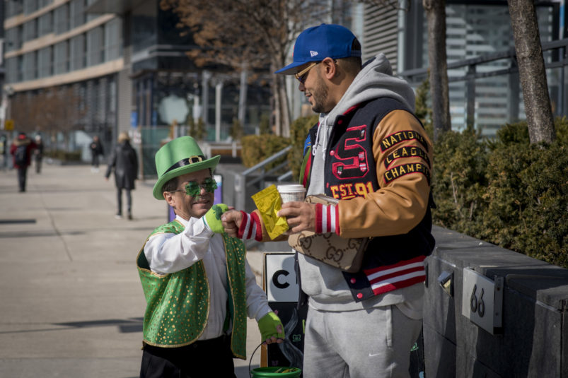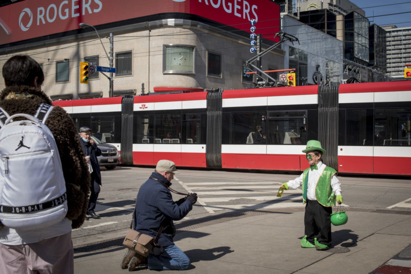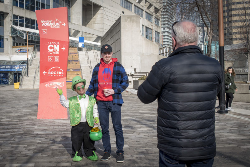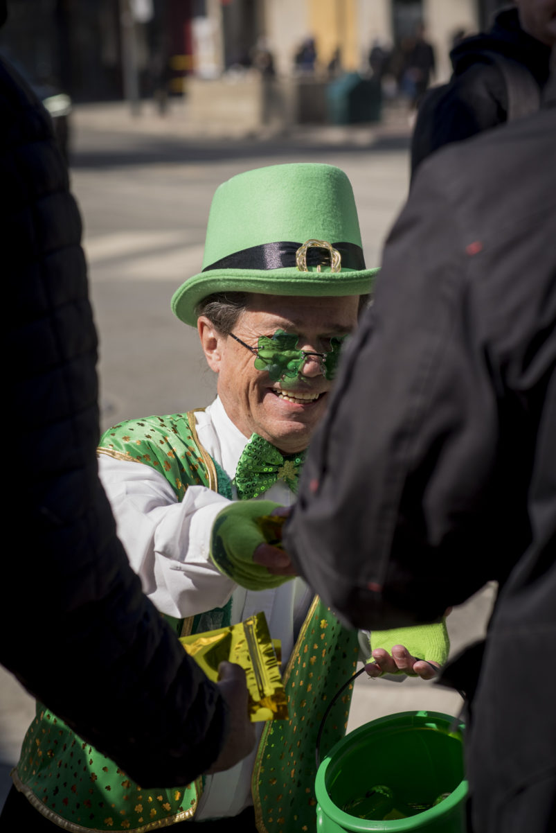The day dawned bright and promising as our magical leprechaun leaped, pranced and danced his way through Toronto. With the sun out and temps at around 16 degrees, Torontonians were out and about in large numbers. The warm spring day definitely had everyone in a great mood – that was made even better by CAFE’s lucky leprechaun dancing about and handing out little golden nuggets to one and all! Our gold nuggets are for adults only, so kids had to miss out on this one. But we surely had a lot of very happy adults, and put a lot of big smiles on faces all across the city!