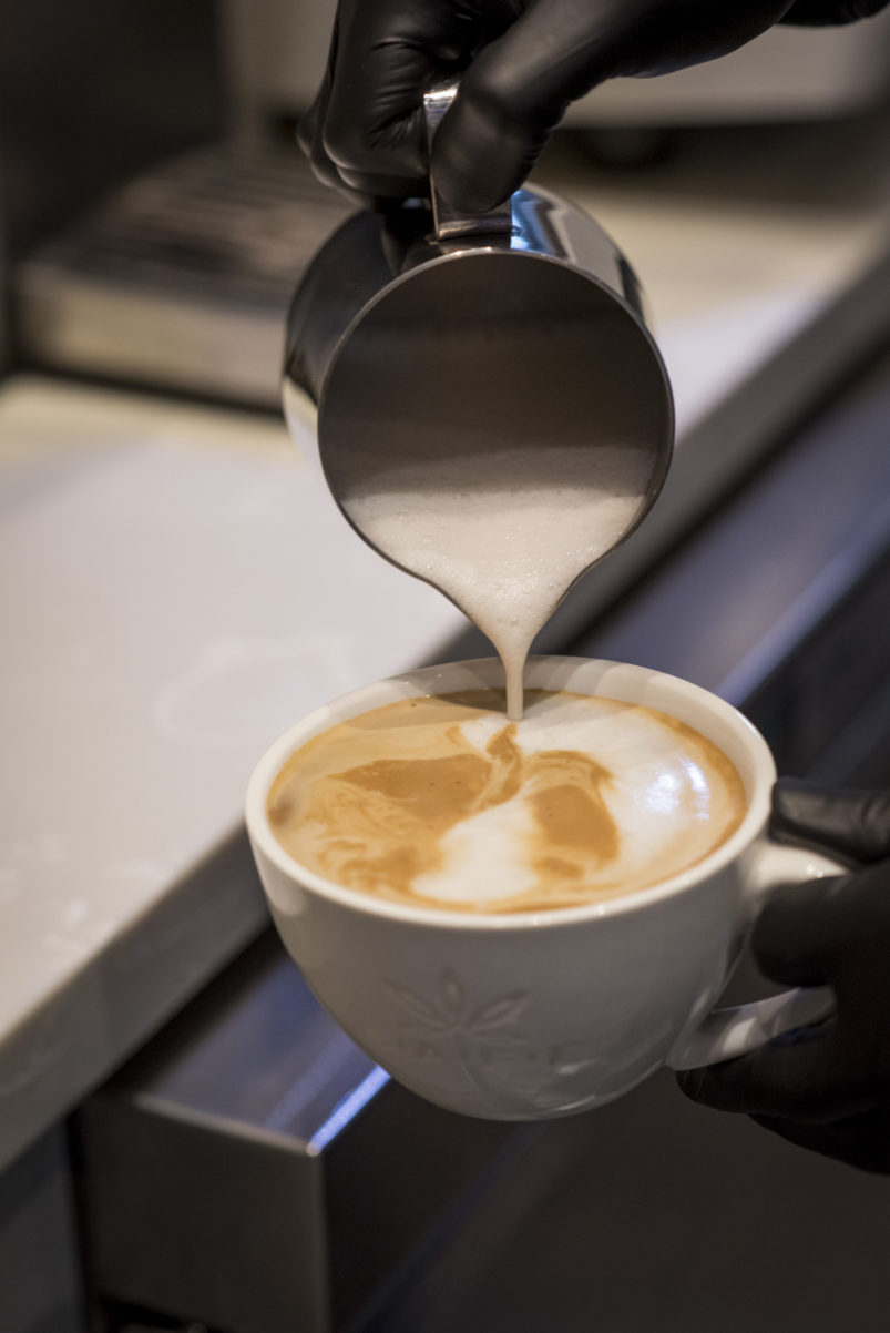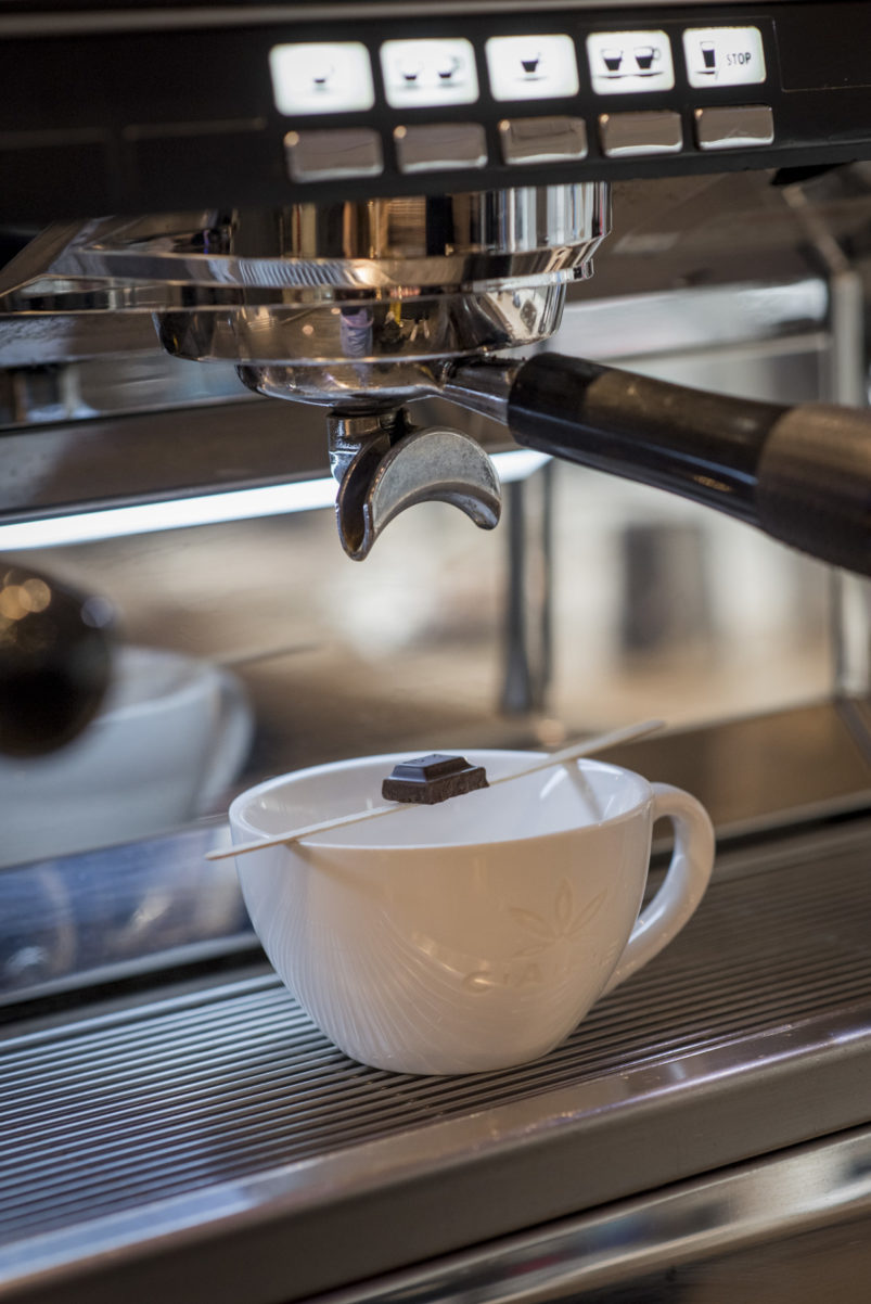 For the making of this Mochachino, Dom selected a 20mg serving of Euphoria Extractions Mint Dark Chocolate Sativa Shatter Bar. The chocolate is placed directly below the stream of freshly ground espresso, and melts as the hot coffee pours over it into the cup below. The remaining chocolate is then blended with the espresso by hand, for an even consistency. Our barista steams fresh milk of choice and pours the hot, frothy milk into the cup. The infused mochachino is topped with a delicious chocolate swirl and is ready to be enjoyed by you!